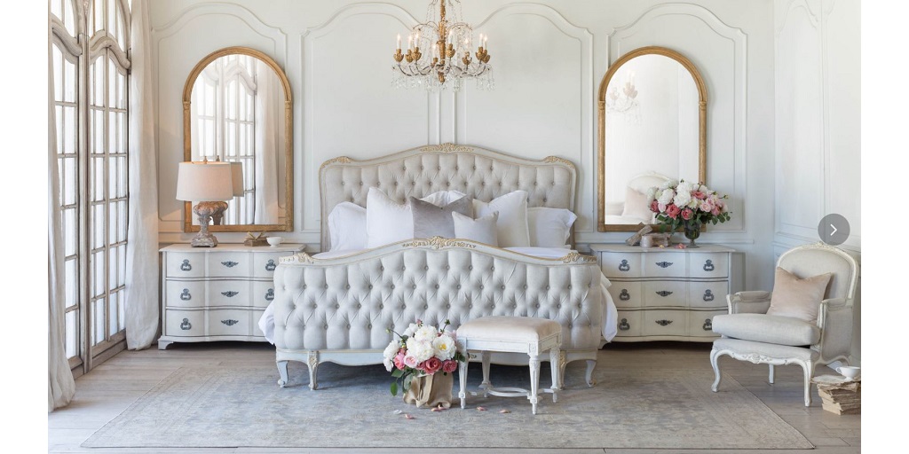 Start with the bed, which is usually the largest piece of furniture in the room. Something with an ornate headboard, such as the Dauphine bed from Eloquence, makes an elegant statement without being flashy. It’s a Louis XVI-style bed that features beautiful hand carvings along the edges of both the headboard and footboard. It’s available in finishes and styles that suit the French country aesthetic: White Linen and Weathered White Finish and Fog Linen and Beach House Natural Finish for the regular Dauphine beds, and White Linen and Weathered White Finish and Fog Linen and Beach House Natural Finish for the Dauphine canopy beds.